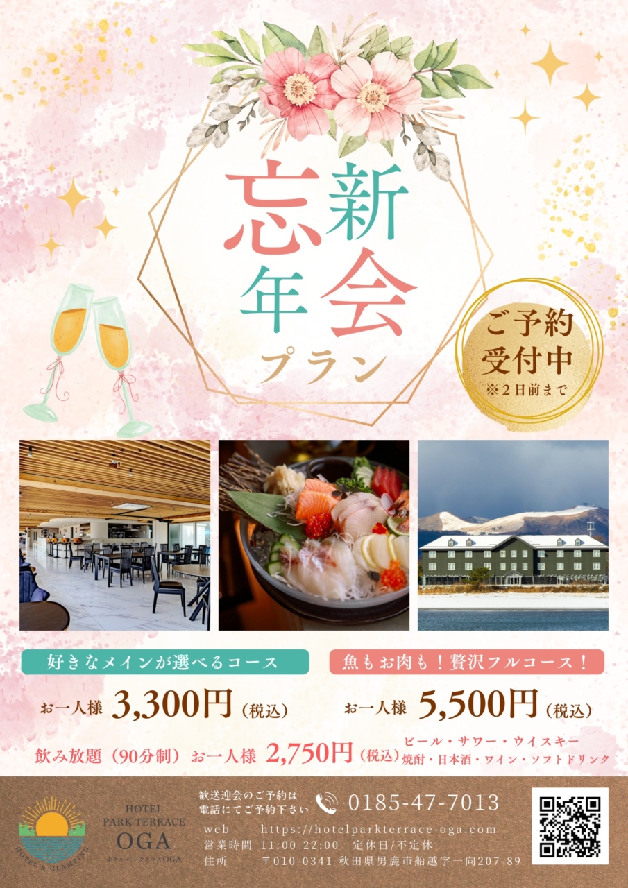 当ホテルでは、皆様の輝かしい一年の締めくくりと、新年の門出を祝うにふさわしい「忘新年会プラン」をご用意いたしました。